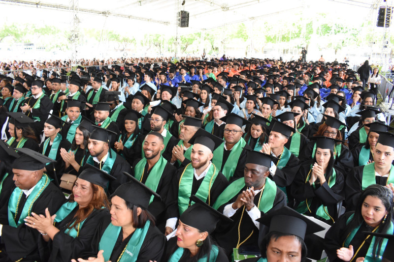 La ceremonia de graduación se realizó en dos jornadas. Este jueves correspondió al campus Santo Domingo, donde fueron investidos 572 estudiantes de grado; 100 títulos de posgrado, y el próximo sábado, en el recinto La Vega, serán entregados 93 títulos.
