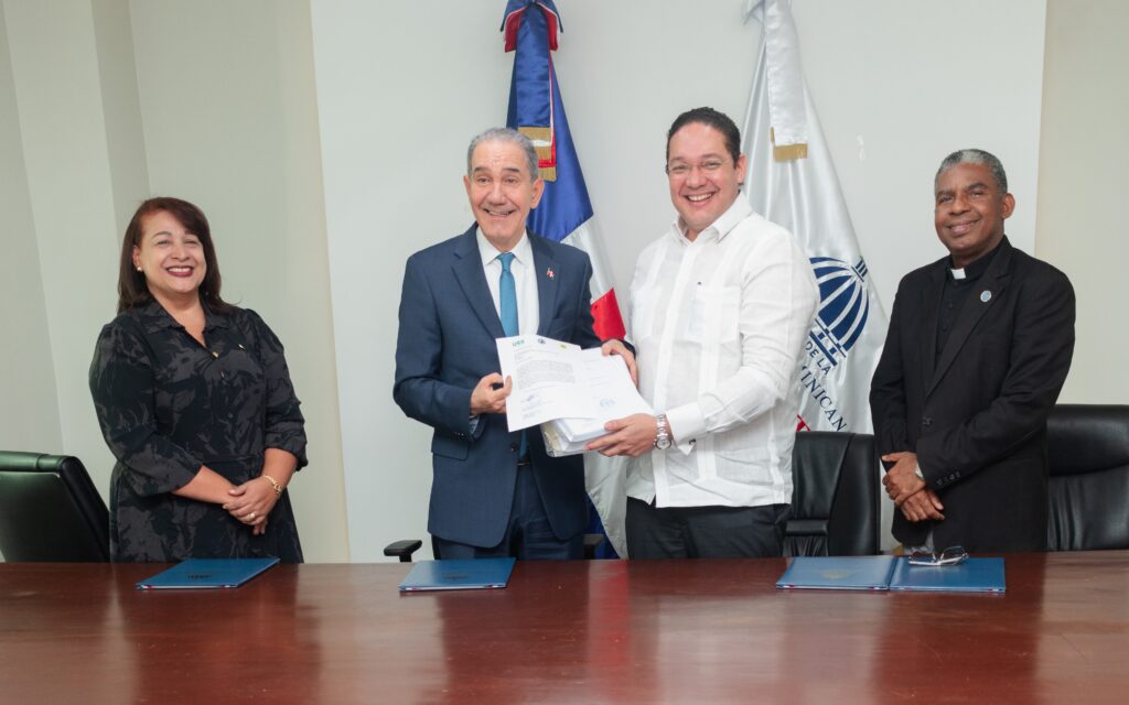Las instituciones de estudios superior firmaron el acuerdo en las instalaciones del MESCYT, de la mano de sus rectores, licenciado José Altagracia Hazim Torres de la UCE; Reverendo Padre, doctor Sergio de la Cruz de los Santos de UCATECI y la ingeniera Marilyn Díaz de UTECO.