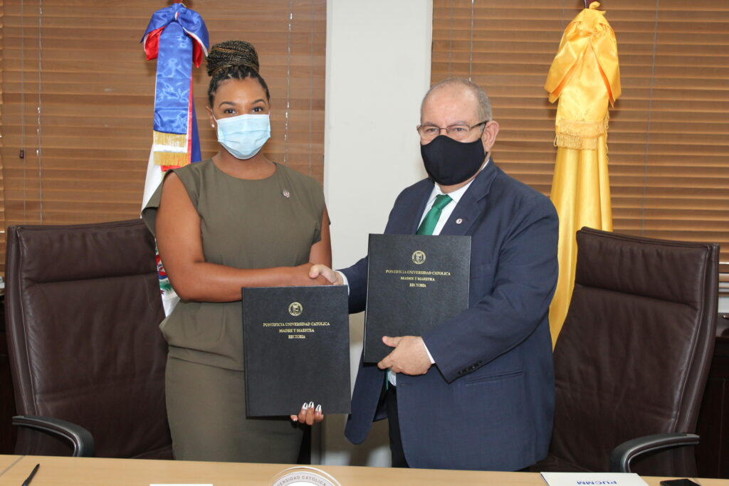 Este convenio de colaboración interinstitucional fue rubricado este miércoles por el rector de la PUCMM, doctor David Álvarez y la presidenta de la DBA, doctora Doralyn De Dios, en la sede del centro universitario, con la asistencia de sus autoridades.