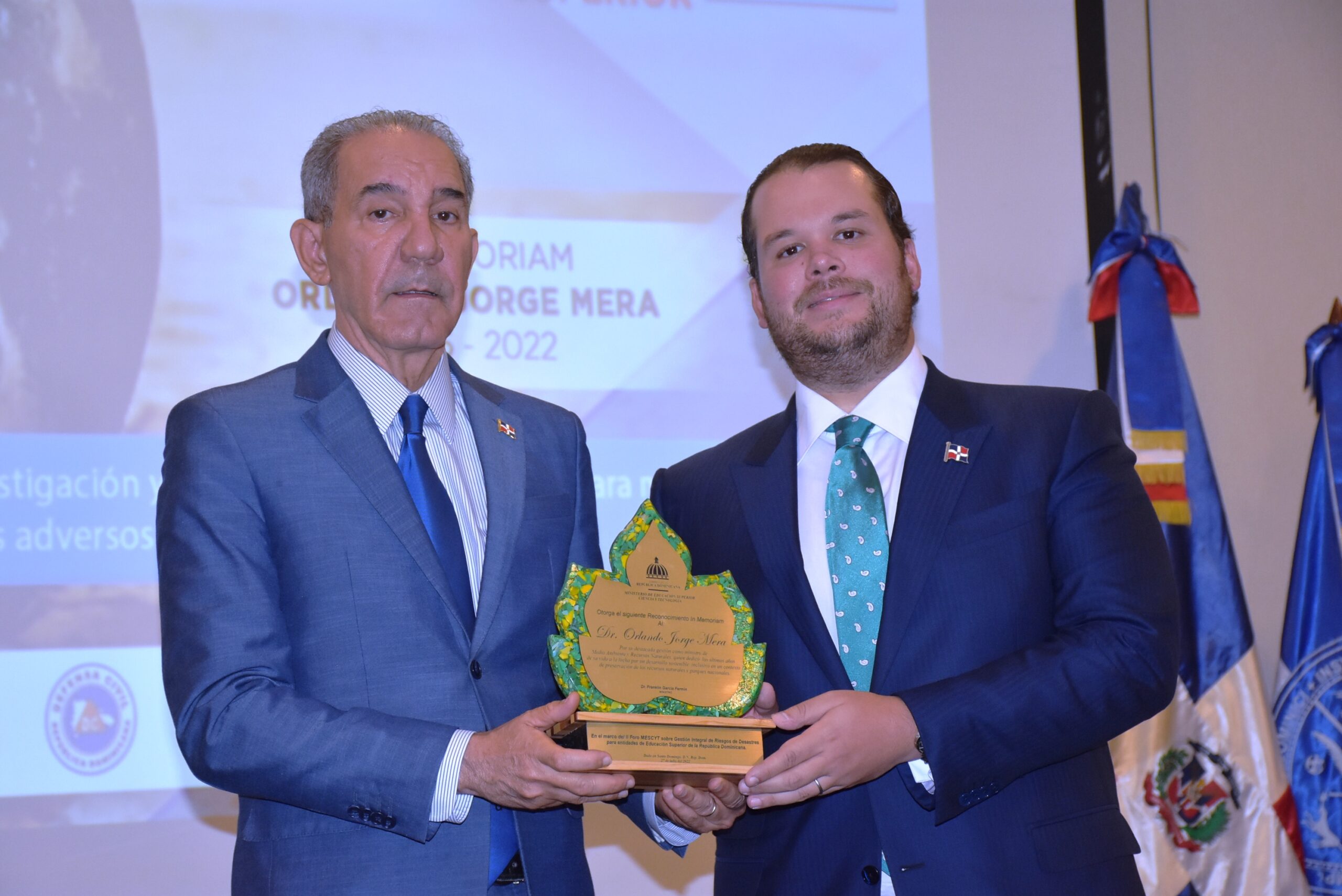 En el desarrollo del evento, el titular del Mescyt entregó una placa en homenaje póstumo al fallecido ministro de Medio Ambiente y Recursos Naturales, Orlando Jorge Mera, la cual fue recibida por su hijo, el diputado Orlando Jorge Villegas, quien agradeció la distinción otorgada a su padre.