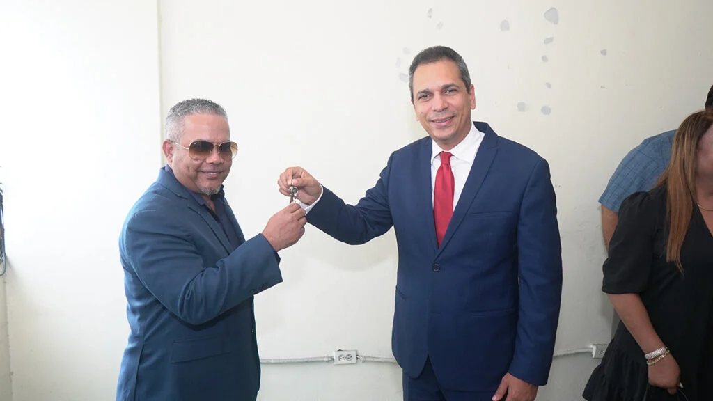 El rector del ITLA Omar Méndez Lluberes recibe de manos del Senador por la provincia Monseñor Nouel Héctor Acosta, las llaves del local donde operará una extensión del ITLA