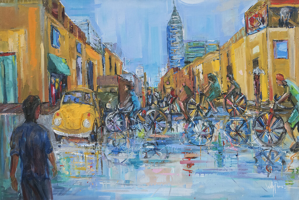 La suya es, por tanto, una pintura que extrae y expresa la belleza que para el artista subyace incluso en las carencias de las casas de las márgenes de los ríos o en los afanes frenéticos de la supervivencia que representan sus Ciclistas.