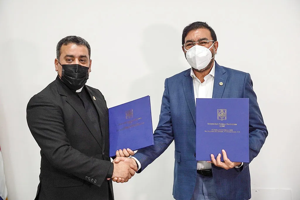 El Rvdo. P., doctor Isaac García de la Cruz, rector de la UCNE y el ingeniero Olmedo Caba Romano, director del Instituto Nacional de Recursos Hidráulicos
