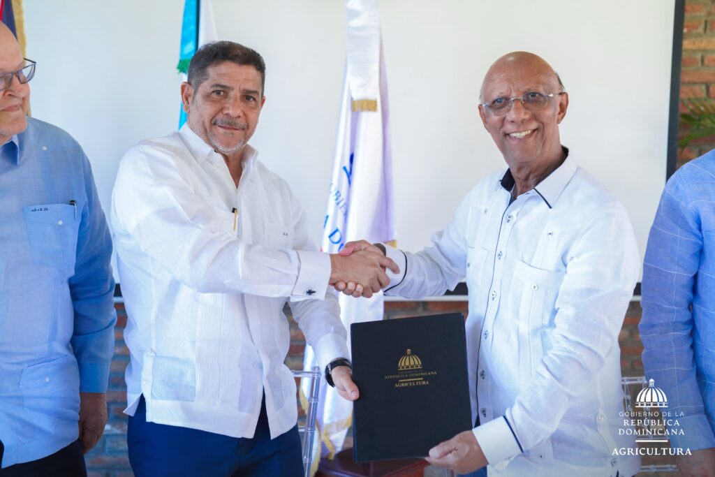 El Rector de la Universidad ISA, ingeniero Benito A. Ferreiras, y el Ministro de Agricultura, Límber Cruz, durante firma de acuerdo con el cuál se deja establecido el compromiso entre ambas instituciones de colaborar para la selección, formación y preparación de jóvenes talentos