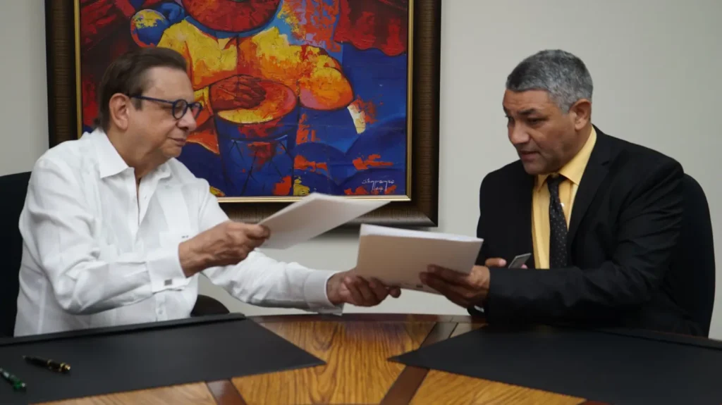 La firma del acuerdo se realizó en la rectoría de la universidad, entre el Arq. Miguel Fiallo Calderón, rector de la UNPHU y el Profesor, Lino Rafael Delgado Marte, representante de la FUDCI.