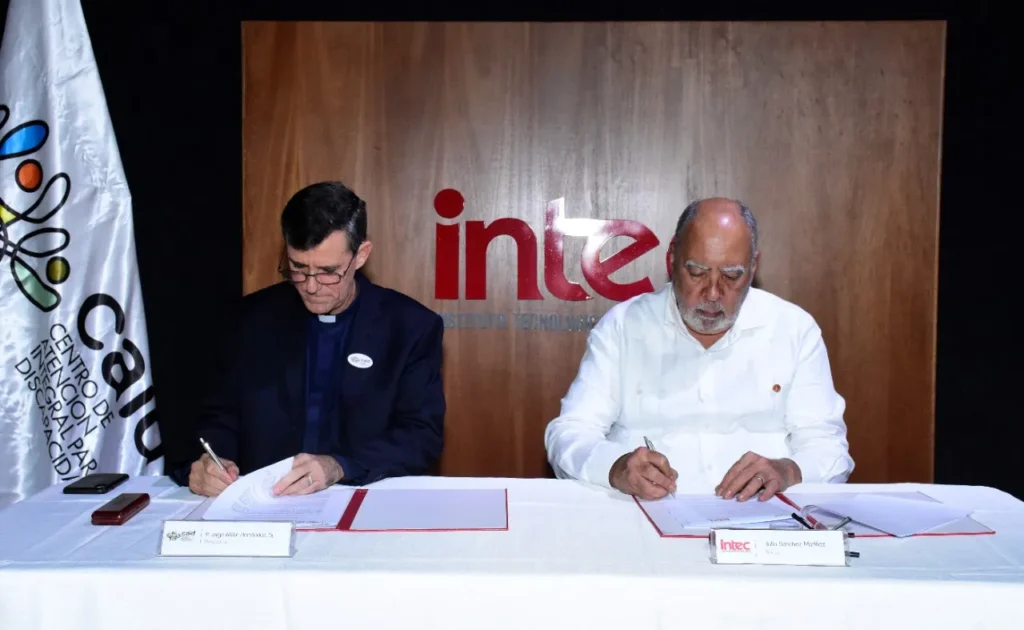 El Padre Jorge William Hernandez Diaz JS, Presidente del Consejo del CAID, junto al Rector de INTEC Julio Sánchez Mariñez durante firma del acuerdo