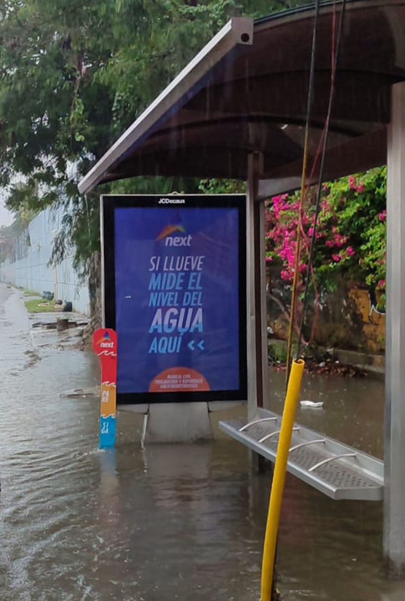 En los últimos años nuestro país ha presenciado los efectos de las inundaciones provocadas por las fuertes lluvias torrenciales, es en este sentido que Next ha convertido estas estructuras de exteriores en una señal de advertencia, donde la gente podrá prever el nivel de riesgo para sus vehículos al transitar por las calles, a través de un medidor agregado al mueble como señal de advertencia para indicar si la calle es transitable en caso de inundación y que los ciudadanos puedan tomar medidas de precaución.