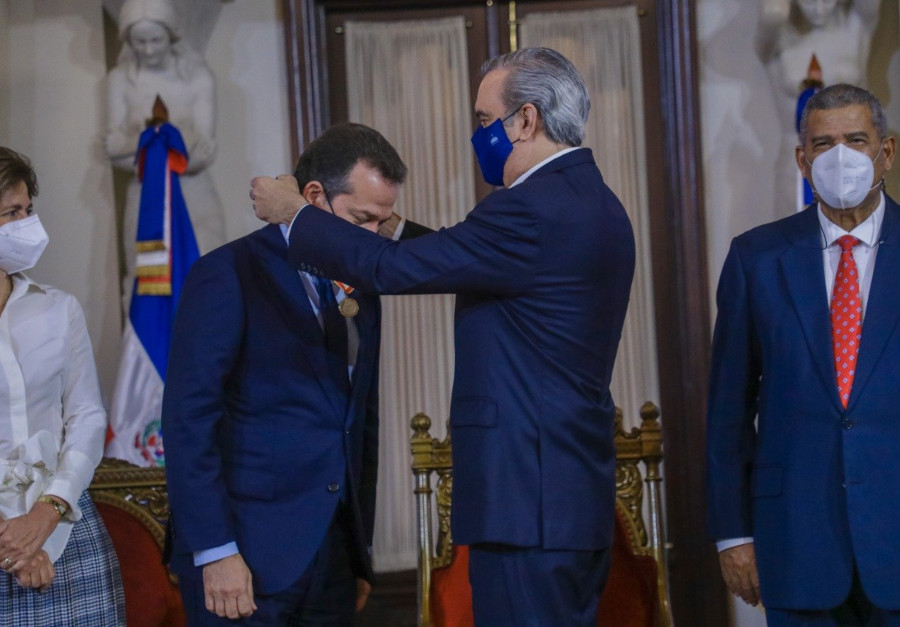 El presidente Luis Abinader coloca la medalla al ministro Víctor-Ito-Bisonó al ganar la medalla de oro en el Premio Nacional a la Calidad y el Reconocimiento a las Prácticas Promisorias en el Sector Público