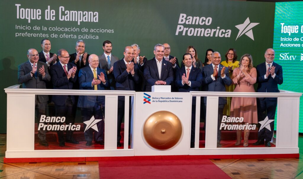 Santo Domingo, RD. El presidente Luis Abinader realizó este martes el simbólico toque de campana que deja iniciada la colocación de acciones preferentes de oferta pública al Banco Promerica, que tras la aprobación de la Superintendencia del Mercado de Valores (SIMV), se convierte en la primera entidad bancaria en emitir acciones a través de la Bolsa de Valores de la República Dominicana (BVRD).