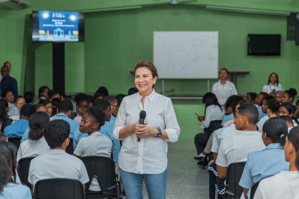 Santo Domingo. Carolina Mejía llevó a estudiantes del Instituto Politécnico Profesor Víctor Rafael Estrella Liz, conocido como “La Perito”, un conversatorio sobre el funcionamiento de la Alcaldía del Distrito Nacional, donde aprovechó para promover entre los jóvenes la buena conducta ciudadana.
