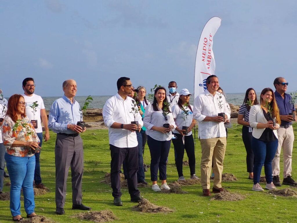 El Ministro de Medio Ambiente y Recursos Naturales, doctor Orlando Jorge Mera, encabezó una jornada de siembra de manglares en Playita de Nigua, como parte de las actividades de clausura del Mes de la Reforestación