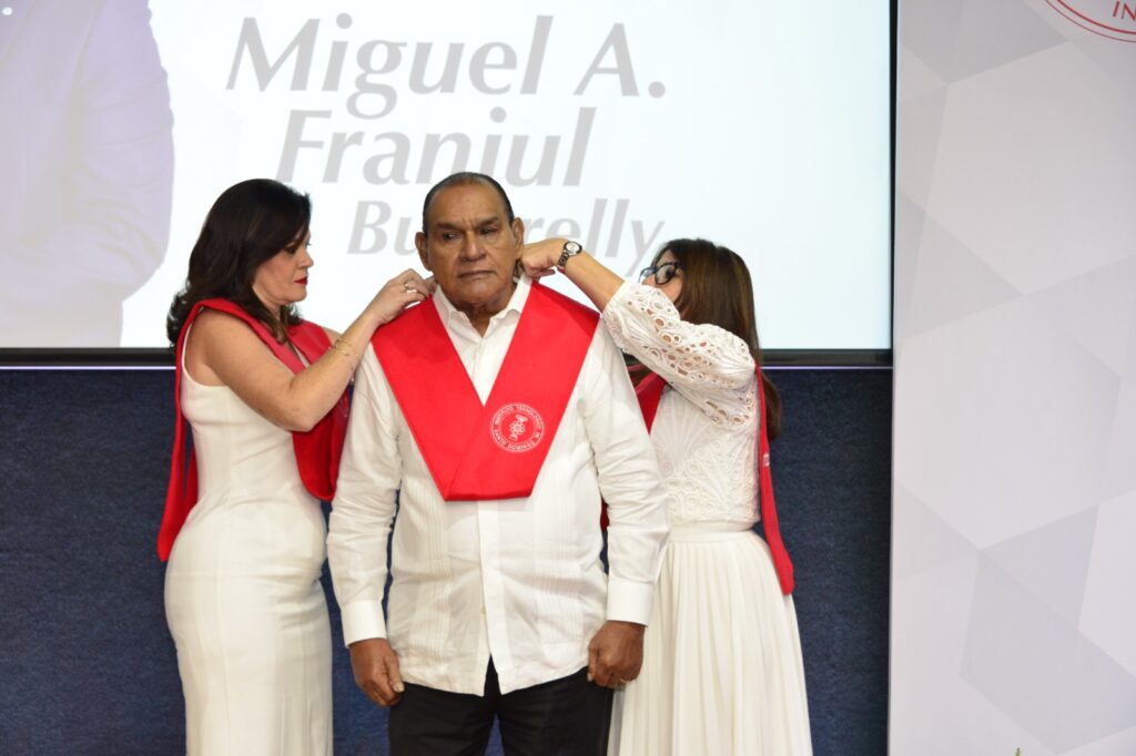 La banda académica roja que distingue a los intecianos fue colocada sobre los hombros de Franjul por las decanas Dalul Ordehi y Luisa Taveras, del Área de Ciencias Sociales y Humanidades, y de la División de Desarrollo Académico, respectivamente.