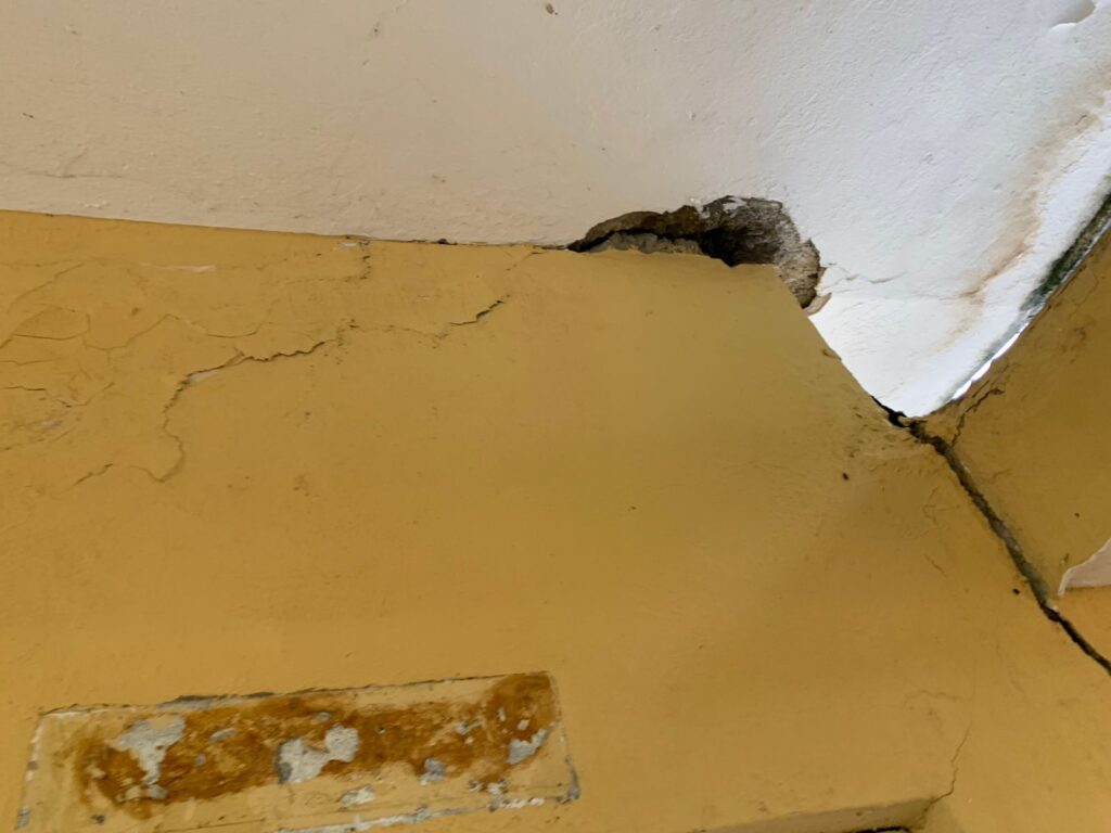 Parte de las grietas que presenta la Escuela Santa Ana en Villa Tapia, construida hace más de 40 años; la cual ya no aguanta más reparaciones, por lo que piden que la edificación sea demolida