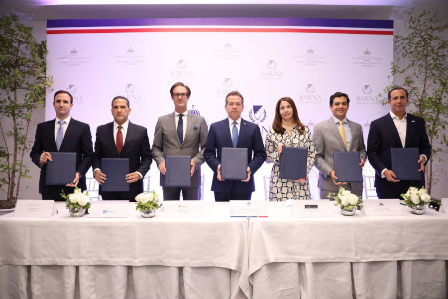 El compromiso con Barna Management School fue rubricado por el ministro de Industria, Comercio y Mipymes (MICM), Víctor Ito Bisonó; Paulo Álvarez, rector de Barna; Cristopher Paniagua, presidente ejecutivo del Banco Popular; y Anyarlene Bergés, vicepresidenta de Relaciones Institucionales, Comunicaciones y Sostenibilidad de INICIA.