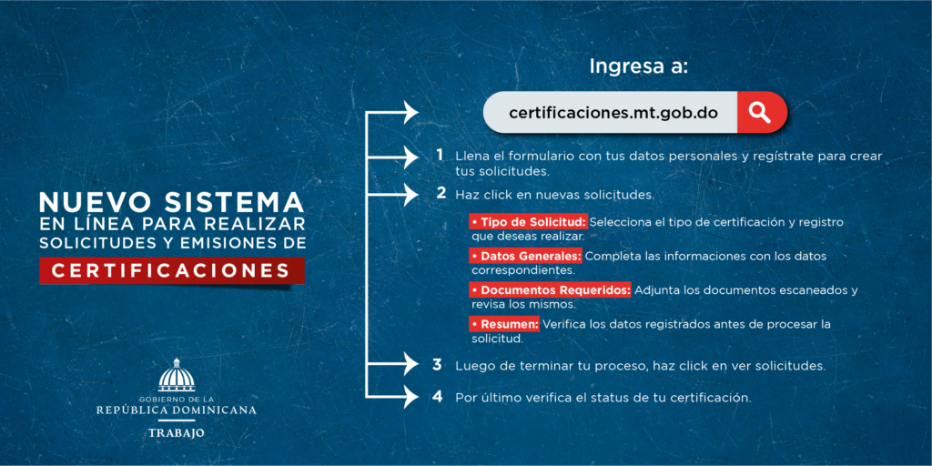 Los usuarios interesados en adquirir una certificación solo tendrán que ingresar al enlace https://certificaciones.mt.gob.do, registrarse en el portal y seguir los pasos de manera sencilla.