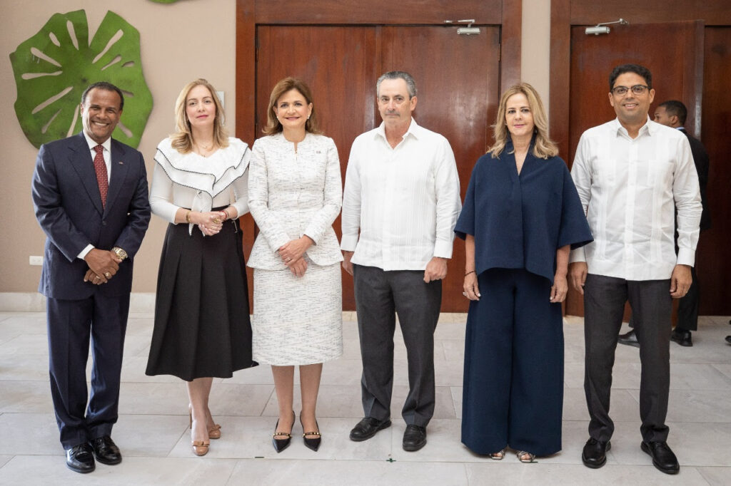 Román Medina Diplan, director del comité provincial de AMCHAMDR en Puerto Plata; María Waleska Álvarez, presidenta ejecutiva del NAP del Caribe; Raquel Peña, vicepresidenta de la República; William Malamud, vicepresidente ejecutivo de AMCHAMDR; Maria Isabel Cáceres, miembro del comité provincial de AMCHAMDR en Puerto Plata; y Juan Roberto Amell, director de Asuntos Corporativos en Bepensa Dominicana.