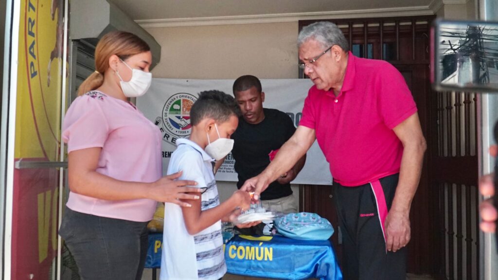 El presidente de FREDOCO, Luis Acosta Moreta –LUIS EL GALLO- en momentos que reparte mochilas conteniendo cuadernos, y otros útiles escolares